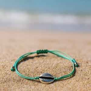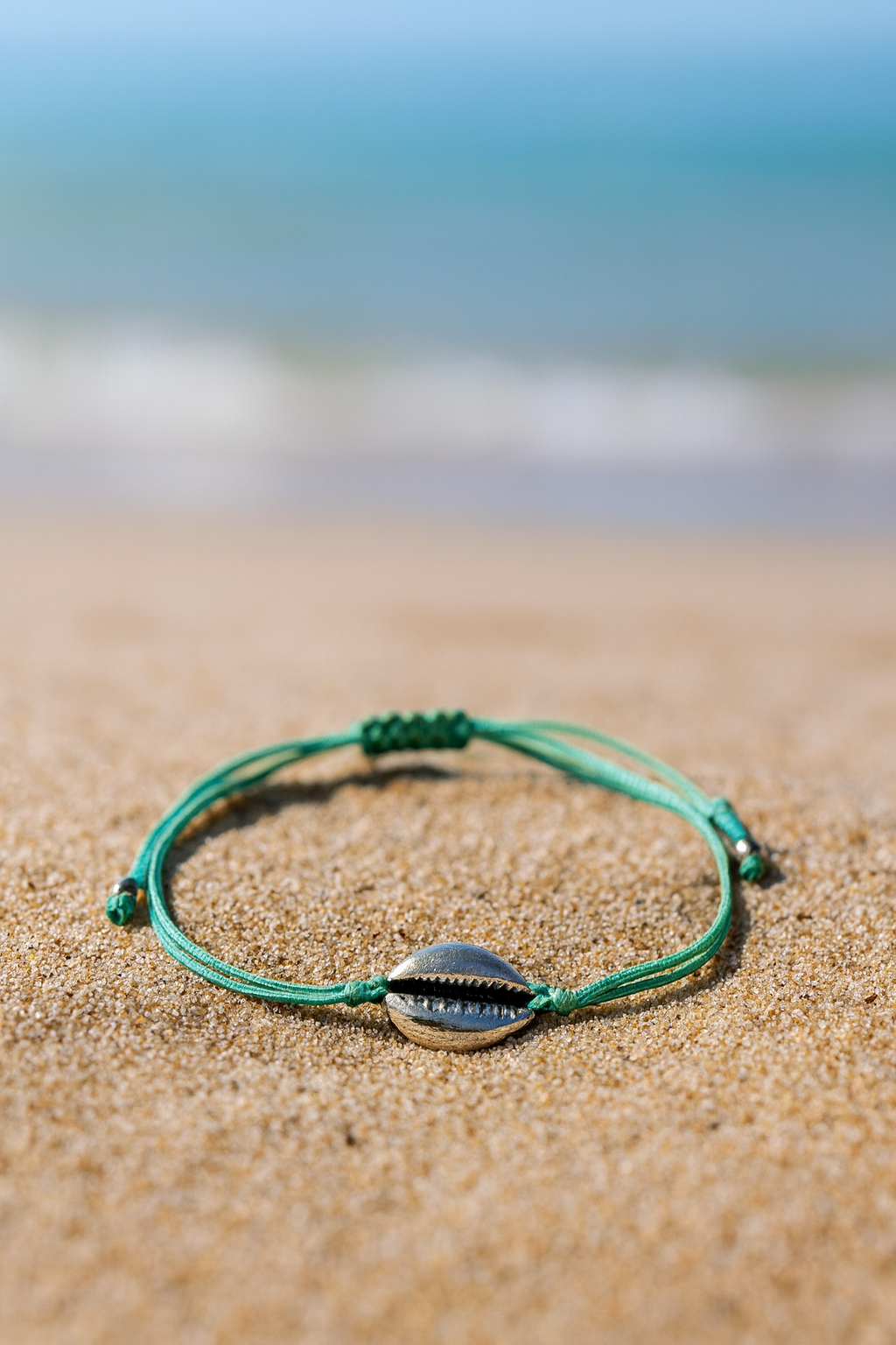 Bracelet made with colored threads and various fun silver designs. Shell charm.