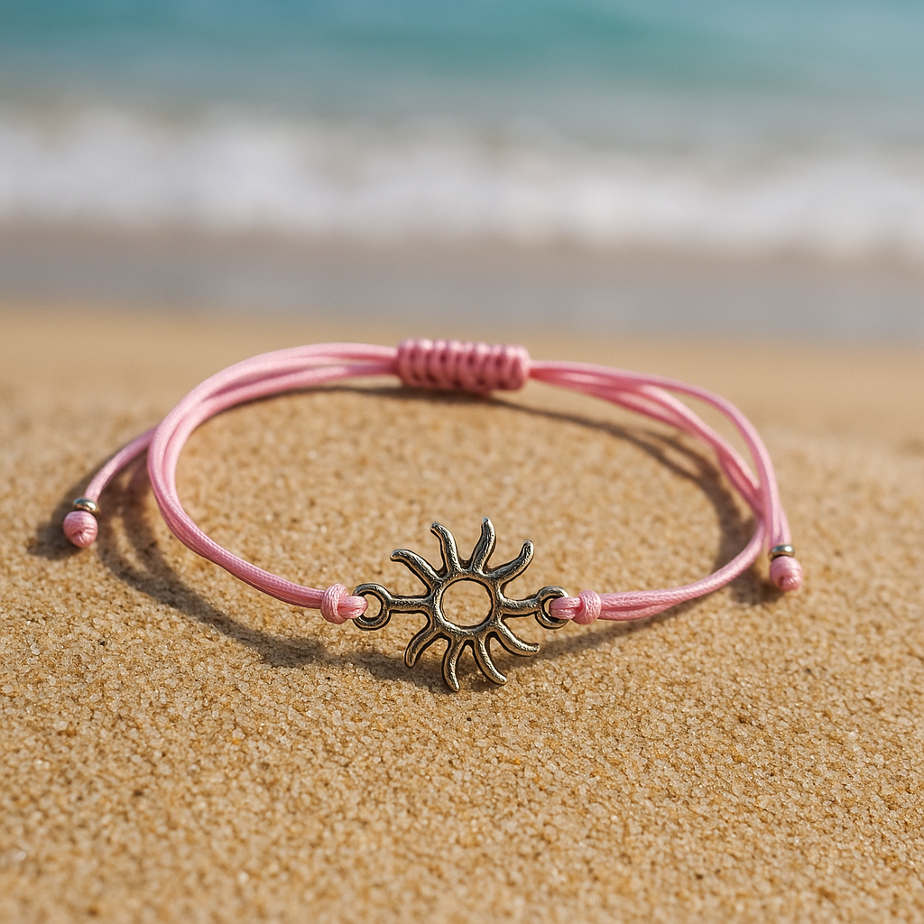 Bracelet made with colored threads and various fun silver designs. Sun charm.