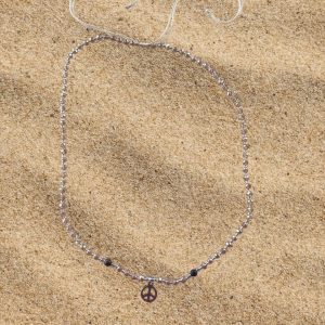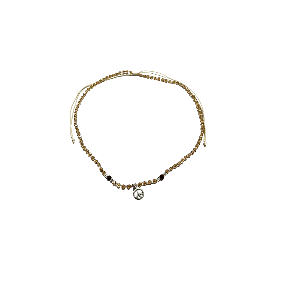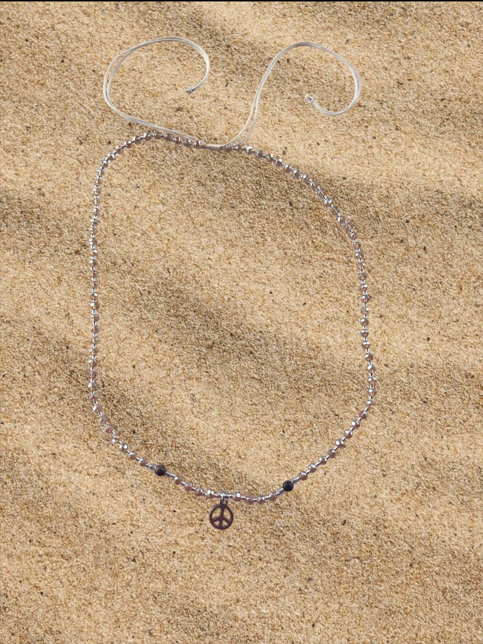 Elegant and minimal, this beaded necklace features a delicate charm that adds a touch of meaning and style. Its lightweight design makes it perfect for layering or wearing on its own for a subtle statement. Peace charm.
