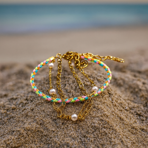 This beautiful bracelet combine different types of chains and charms for a dynamis look.