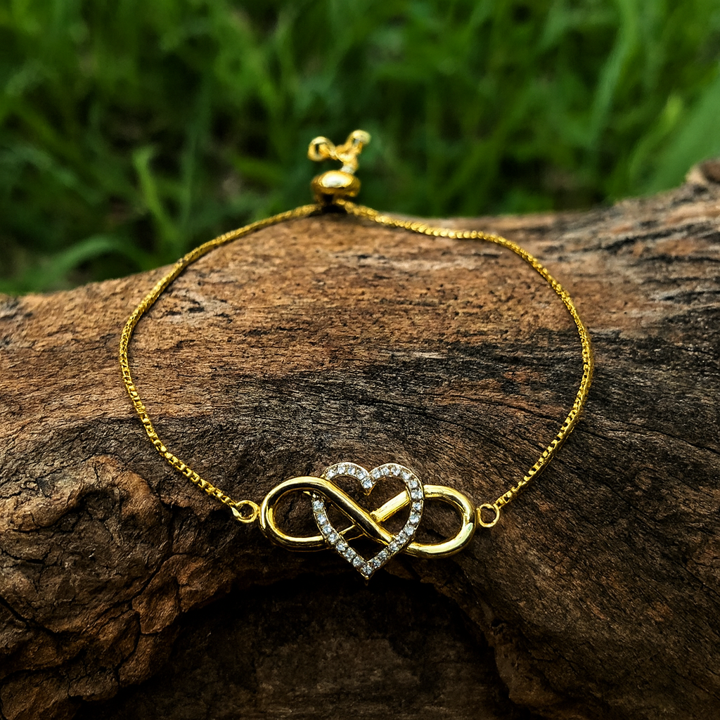 This adjustable gold bracelet features a mix of colorful rainstons and designs, creating a vibrant and eye- catching look. Heart and infinity charm. Evil eye charm.