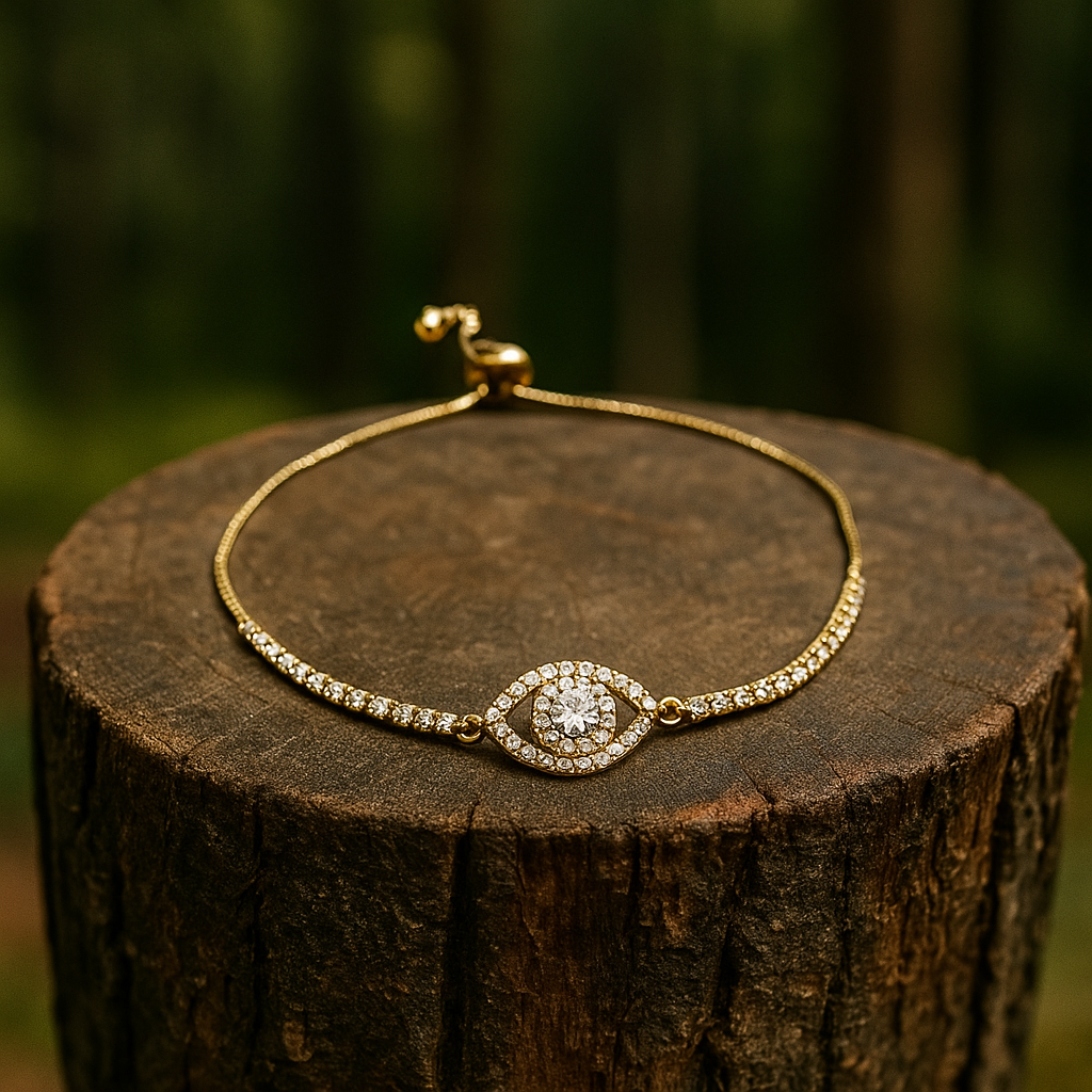 This adjustable gold bracelet features a mix of colorful rainstons and designs, creating a vibrant and eye- catching look.