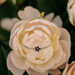 This adjustable gold bracelet features a mix of colorful rainstons and designs, creating a vibrant and eye- catching look. Stones and black flower charm.