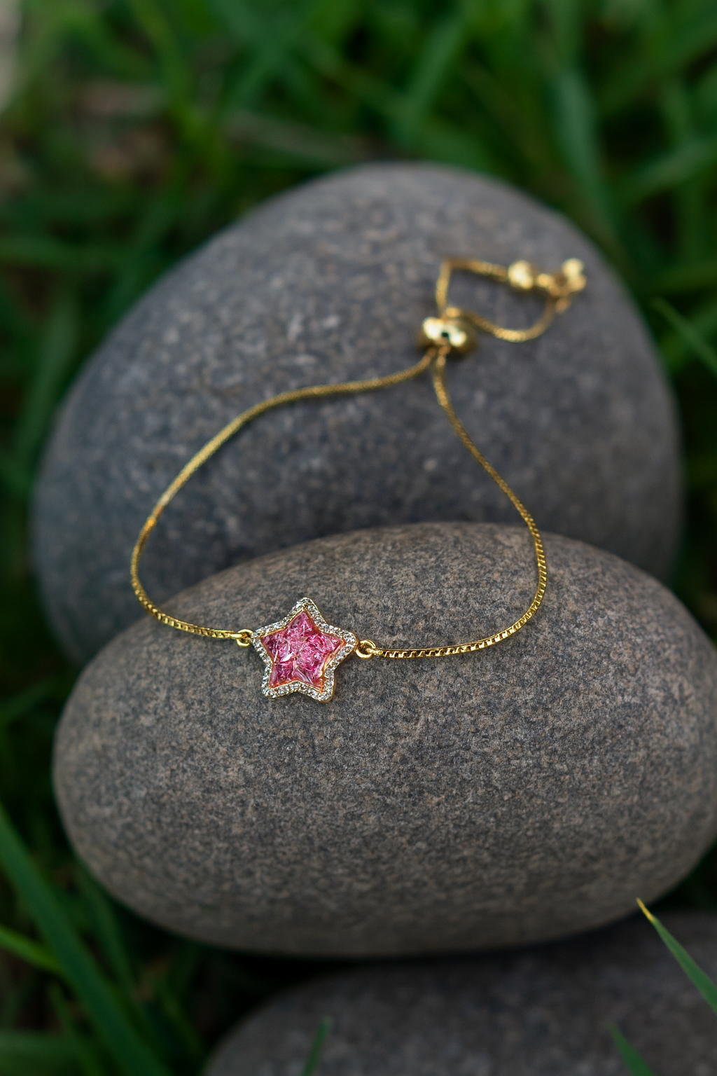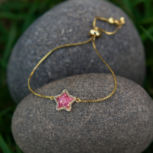 This adjustable gold bracelet features a mix of colorful rainstons and designs, creating a vibrant and eye- catching look. Pink start charm.