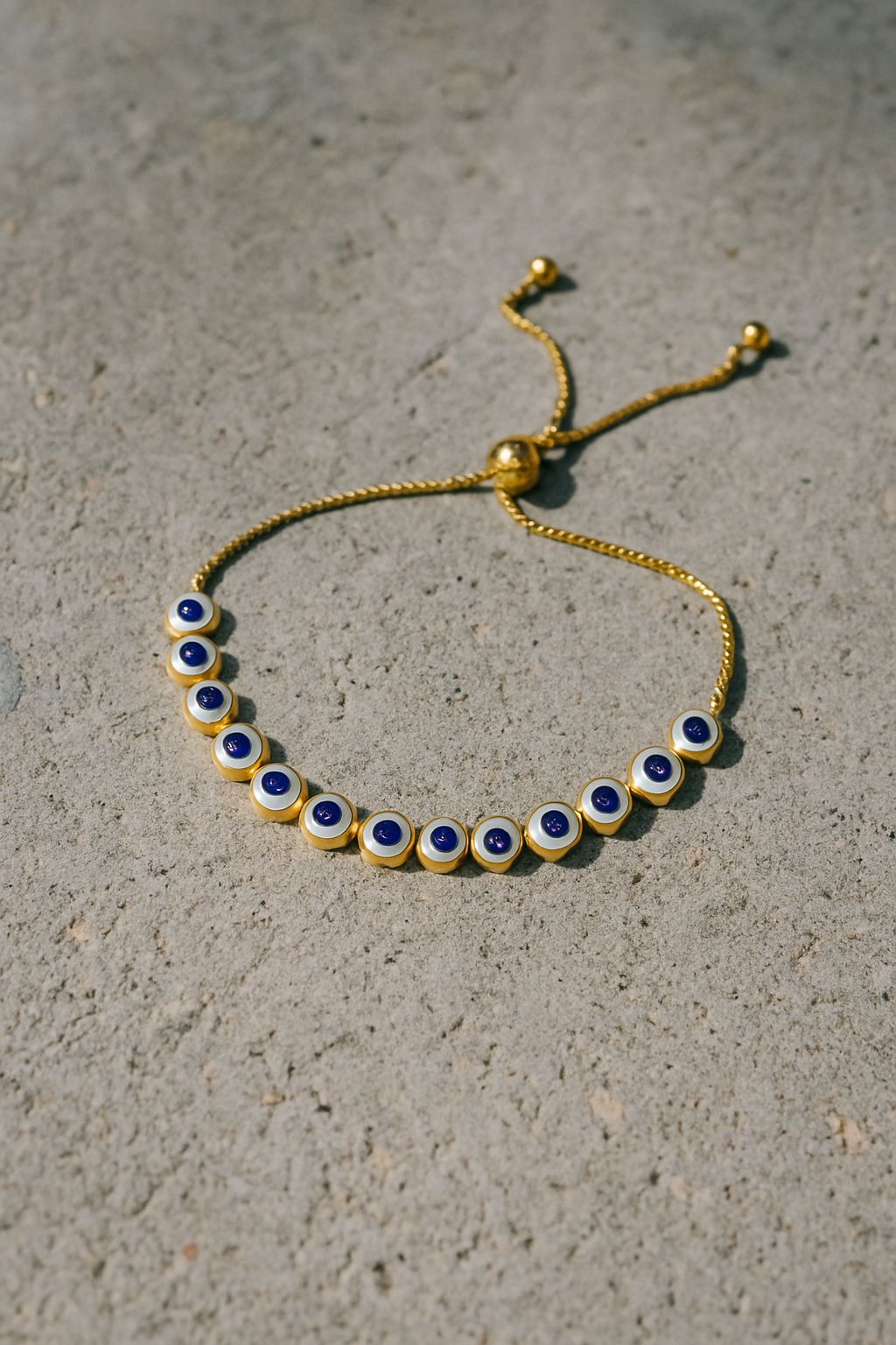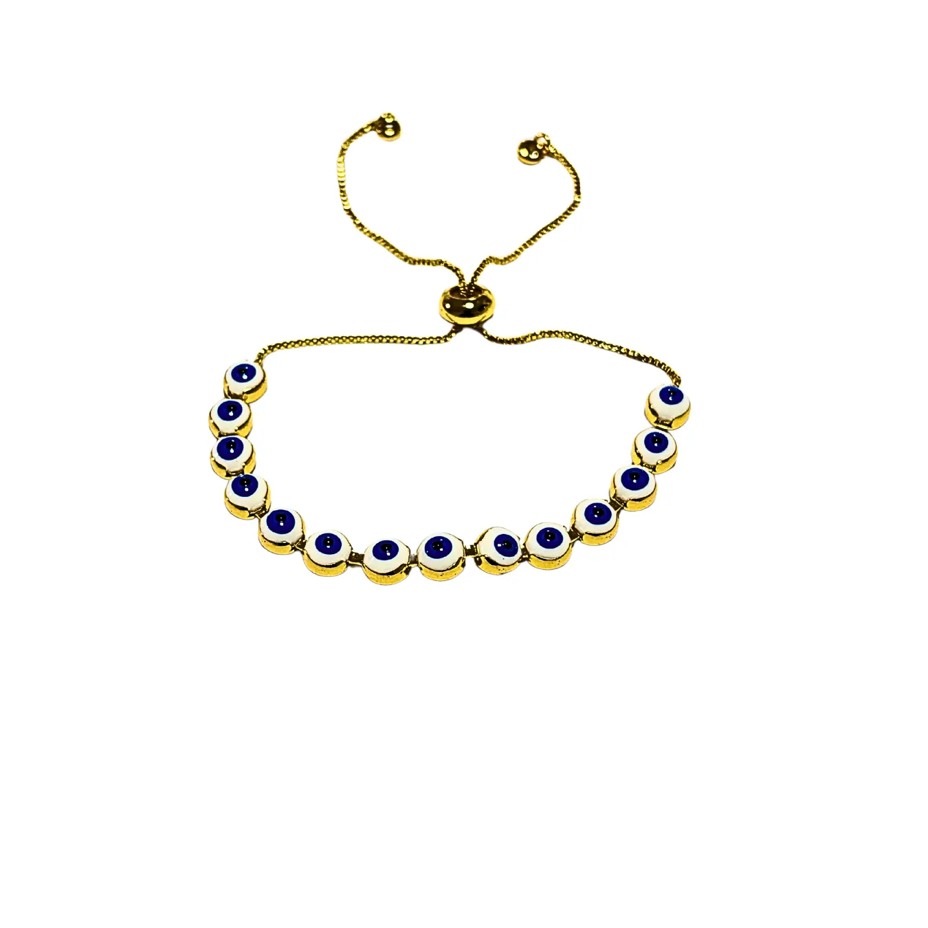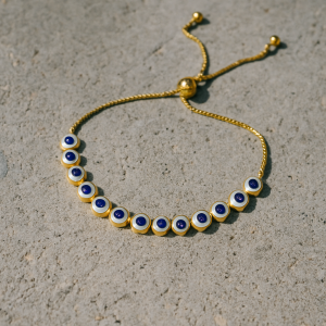 This adjustable gold bracelet features a mix of colorful rainstons and designs, creating a vibrant and eye- catching look. Blue evil eye charms.