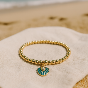 This elastic gold bracelet features a mix of colorful rainstons and designs, creating a vibrant and eye- catching look. Blue shell and pearl charm.