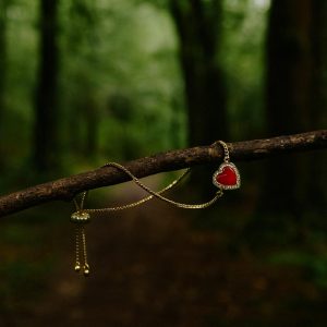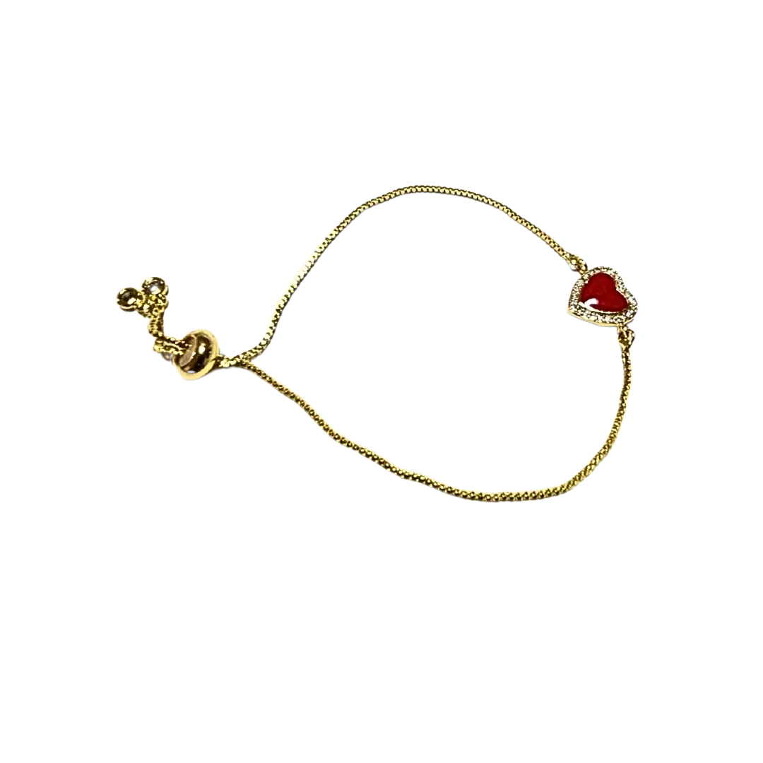 This adjustable gold bracelet features a mix of colorful rainstons and designs, creating a vibrant and eye- catching look. Heart charm.