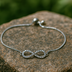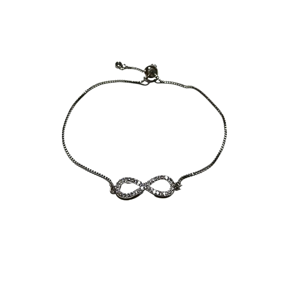 This adjustable silver bracelet features a mix of colorful rainstons and designs, creating a vibrant and eye-catching look. Infinity charm.