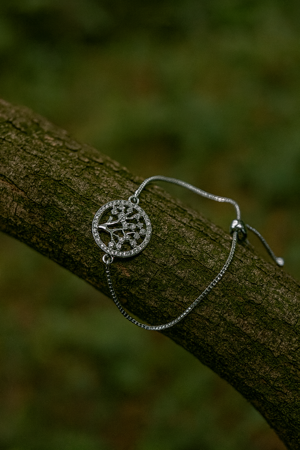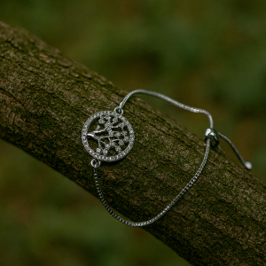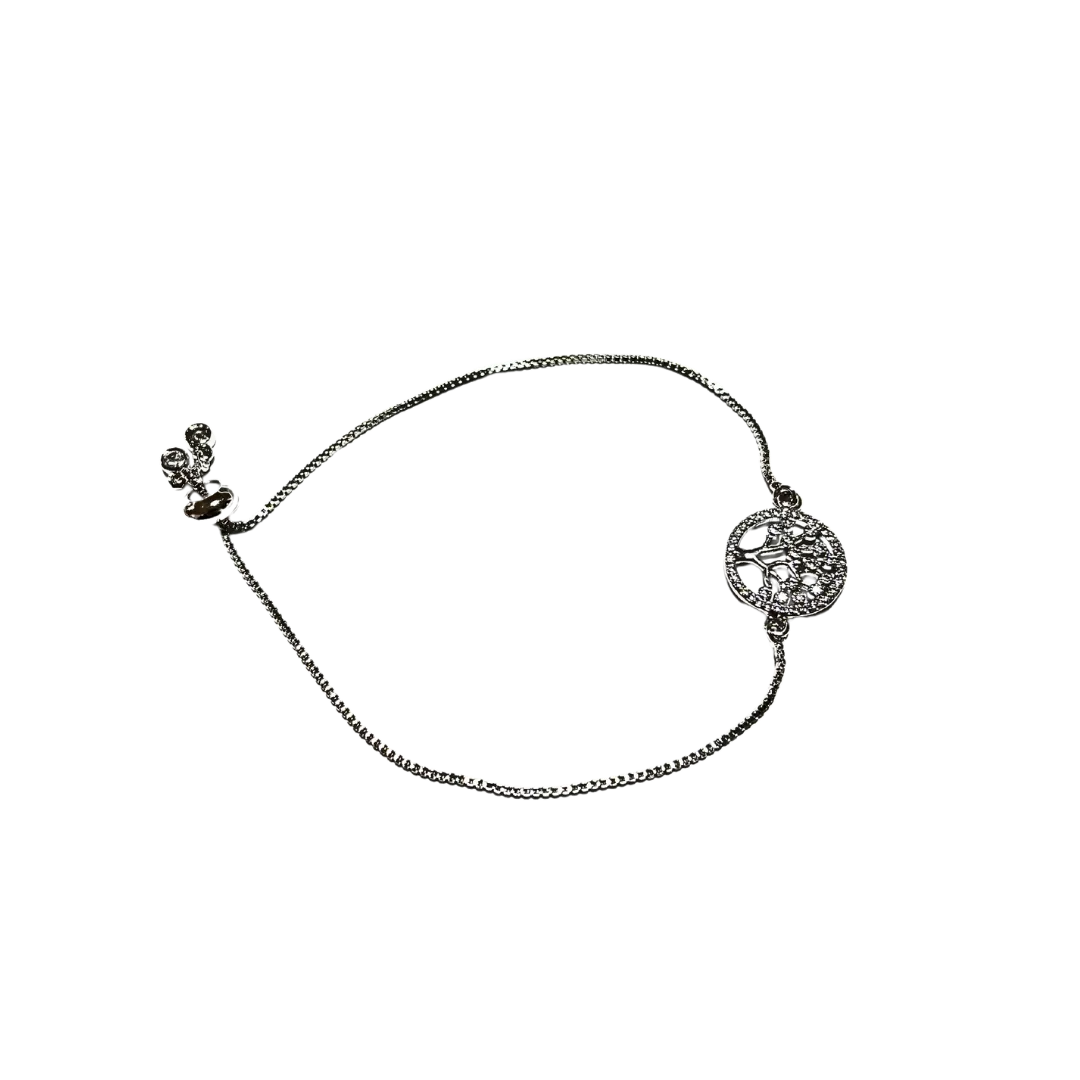 This adjustable silver bracelet features a mix of colorful rainstons and designs, creating a vibrant and eye-catching look. Tree of life charm.