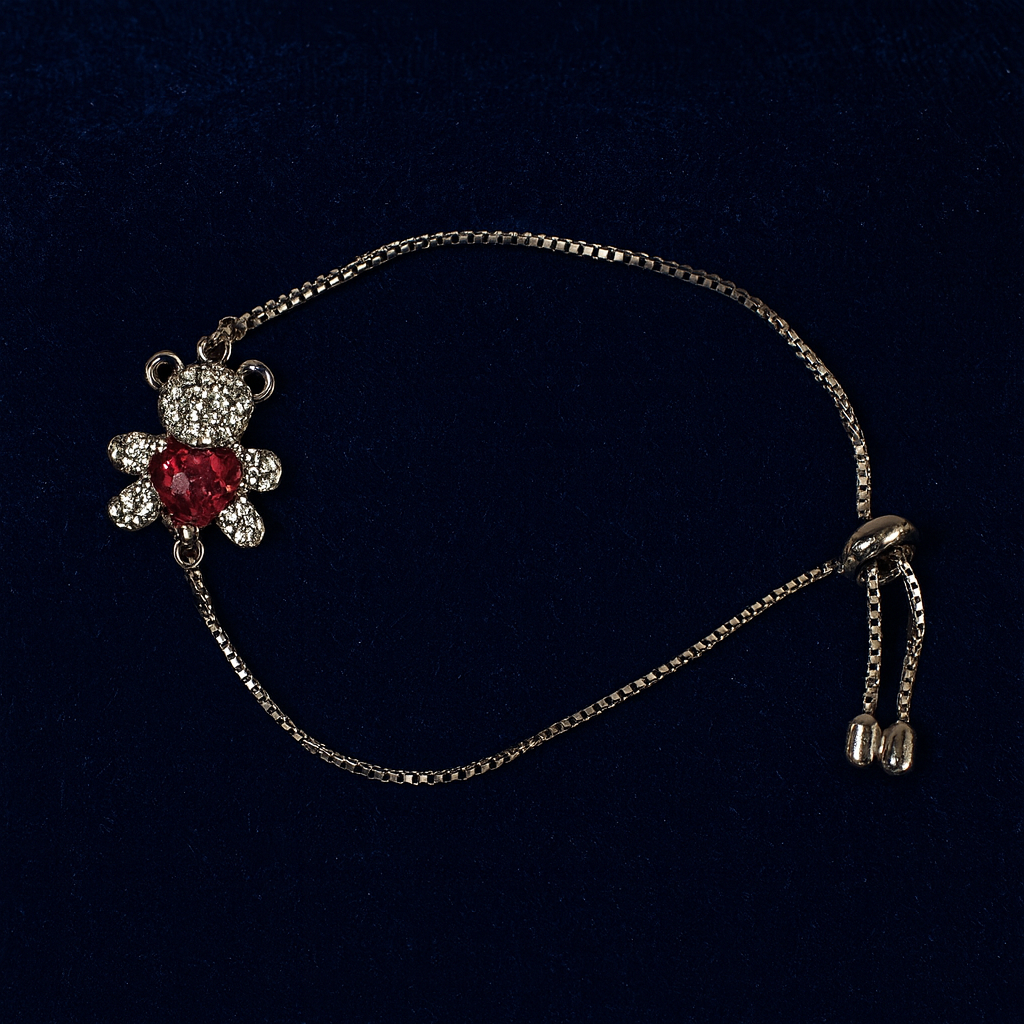 This adjustable silver bracelet features a mix of colorful rainstons and designs, creating a vibrant and eye-catching look. Red bear charm.