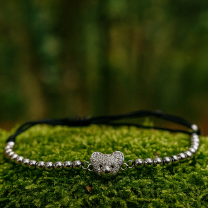 This adjustable silver bracelet features a mix of colorful rainstons and designs, creating a vibrant and eye-catching look. Green bear charm.