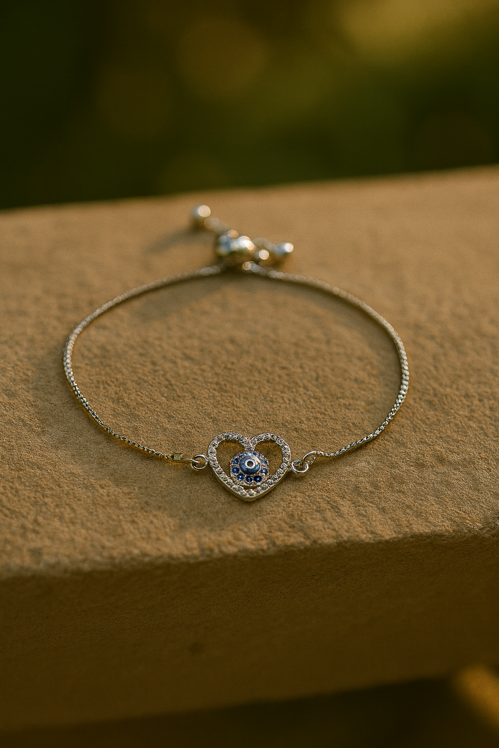 This adjustable silver bracelet features a mix of colorful rainstons and designs, creating a vibrant and eye-catching look. Heart and evil eye charm.