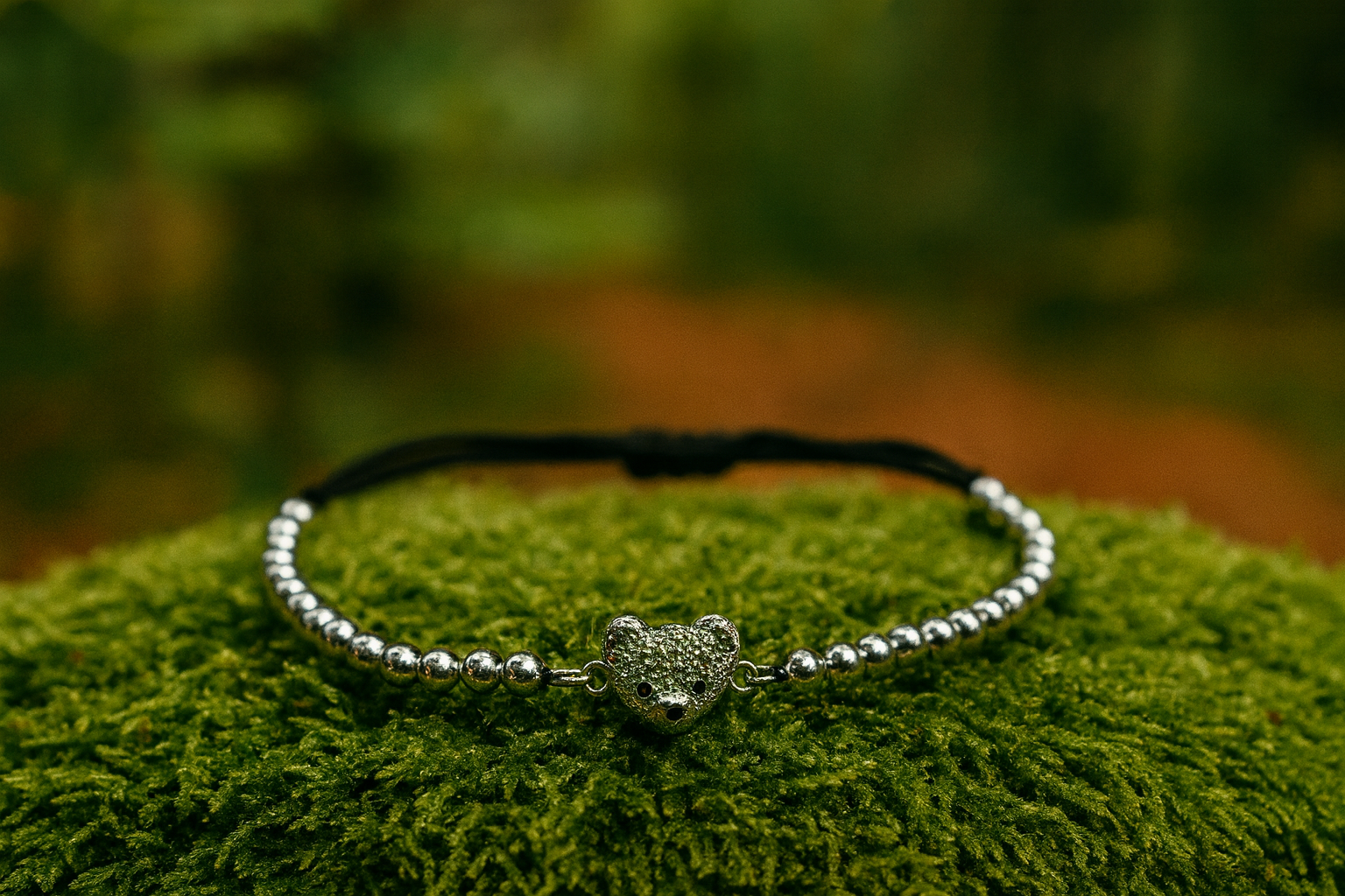 This adjustable silver bracelet features a mix of colorful rainstons and designs, creating a vibrant and eye-catching look. Pink bear charm.